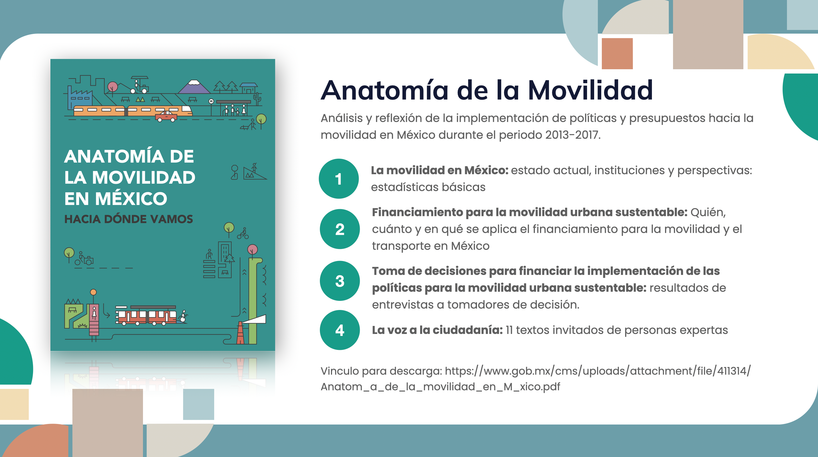 En 2018 lanzamos el libro «Anatomía de la Movilidad en México». El objetivo es ofrecer una fotografía del estado en el cual está la política de movilidad en México, desde los avances legales, institucionales, programaticos y financieros.